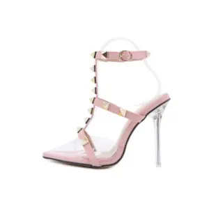 Maximize your glam-up game and bewitch all around you with our iconic Agnes clear stiletto high heels. Offering an elegant and signature look to carry. Precisely crafted with perfection by our artisans, from PVC, PU leather, and refined rubber to provide comfort and durability. The minimalist sensibility, spike trim detailing, and catchy buckle straps make Rockstud embellished heels timeless without sacrificing comfort. Its sleek 8cm high heels and pointed toe will add a dash of attitude. Available in pink, black, apricot, and black colors to match your fashion statement. Pairs well with all your go-to work wardrobe to any party wear.