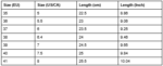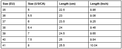 | Size (US/CA) | Size (EU) | Length (cm) | Length (Inch) |