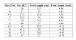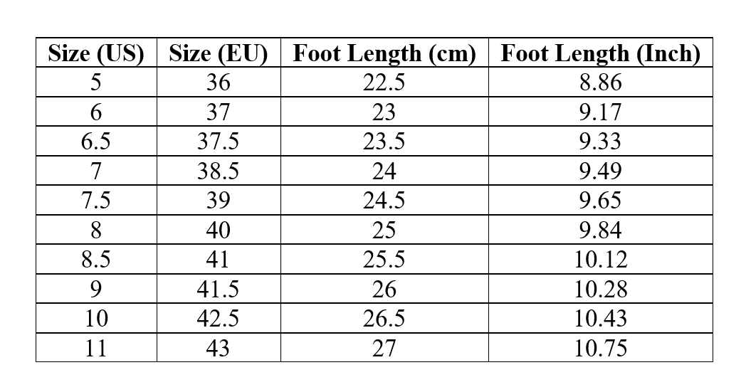 | Size (US) | Size (EU) | Foot Length (cm) | Foot Length (Inch) |