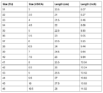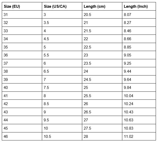 | Size (EU) | Size (US/CA) | Length (cm) | Length (Inch) |