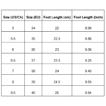 | Size (US/CA) | Size (EU) | Foot Length (cm) | Foot Length (Inch) |