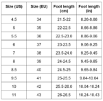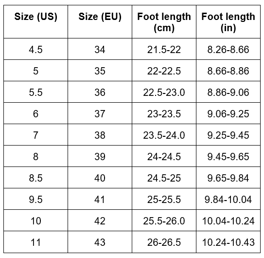 | Size (US/CA) | Size (EU) | Foot length (cm) | Foot length (in) |