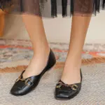Bring out feminine elegance with these leather buckle ballerinas in Black color. These decent but fashionable shoes have a square tip. Premium quality faux leather is used to design these shoes. The horse bit metal buckle on the top gives a very stylish appearance.