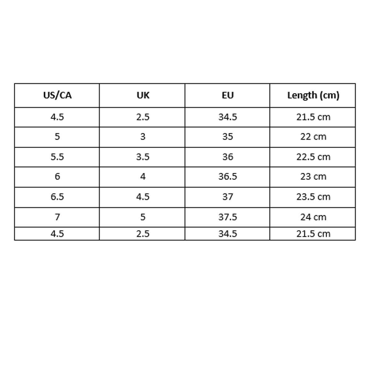 US/CA UK EU Length (cm) 4.5 2.5 34.5 21.5 cm 5 3 35 22 cm 5.5 3.5 36 22.5 cm 6 4 36.5 23 cm 6.5 4.5 37 23.5 cm 7 5 37.5 24 cm 4.5 2.5 34.5 21.5 cm