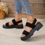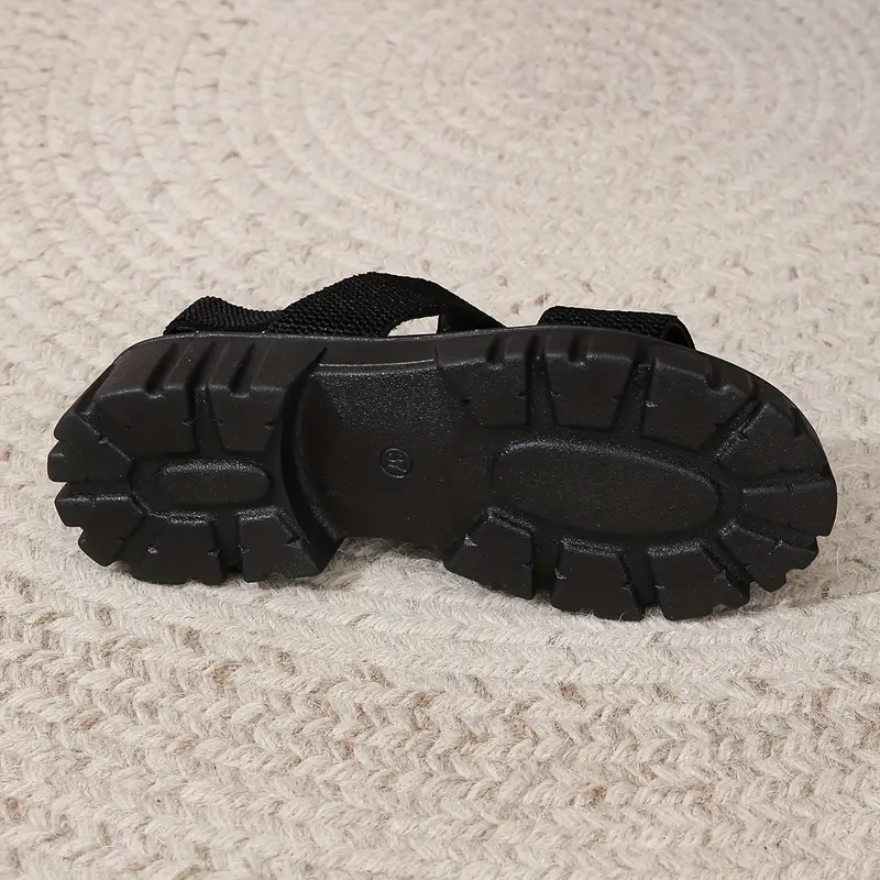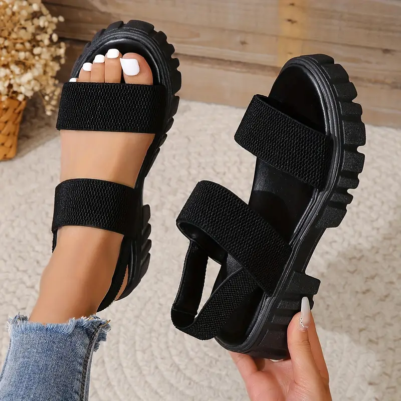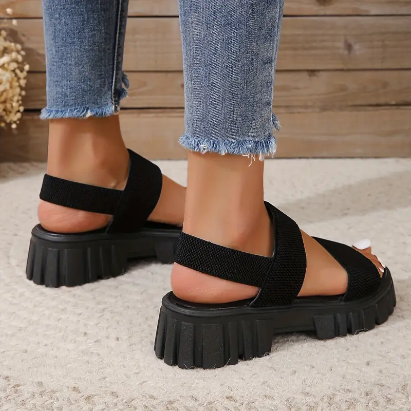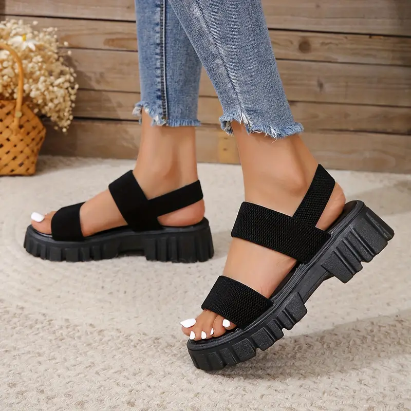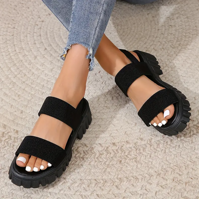 Combining style and grace in these Elastic Strap Lug Sole Sandals. Featuring soft and comfortable elastic straps for nice fit, a thick treaded lug sole with slip-free platform, and super gentle on feet platform all exuding passion in black.