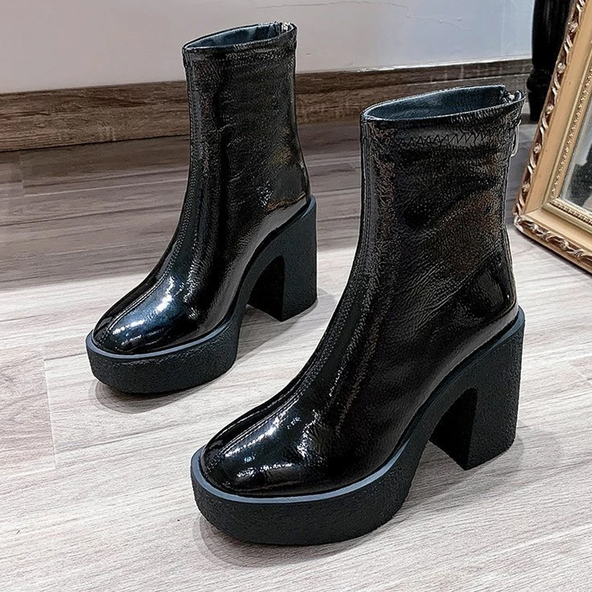 1 PCS x High Heel Chunky Black Boots – Zip Up Ankle Boots