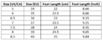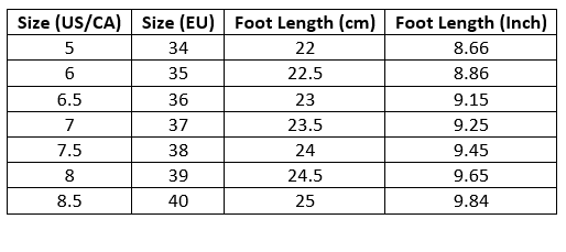 | Size (US/CA) | Size (EU) | Foot Length (cm) | Foot Length (Inch) |