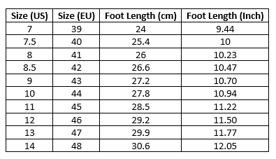 | Size (US/CA) | Size (EU) | Foot Length (cm) | Foot Length (Inch) |