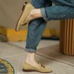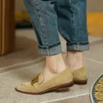 Your fashion statement will be upgraded with these trendy & elegant Embellished Suede Loafers. Made of kid suede, genuine leather, sheepskin, and TPR soles to provide a smooth, soft, and comfortable walking experience. Pair well with maxi dresses, blazers, long socks, and baggy jeans, etc.