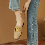 - It’s simply chic in look with its round toe, steel buckle, and slip-on design.