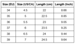 | Size (EU) | Size (US/CA) | Length (cm) | Length (Inch) |