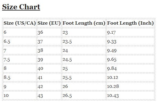 | Size (US/CA) | Size (EU) | Foot Length (cm) | Foot Length (Inch) |