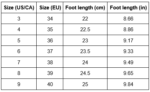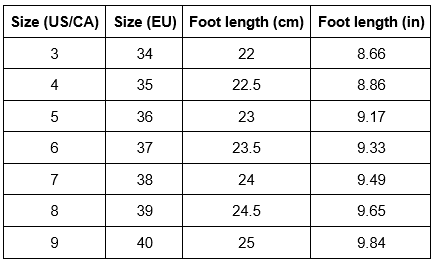 | Size (US/CA) | Size (EU) | Foot length (cm) | Foot length (in) |
