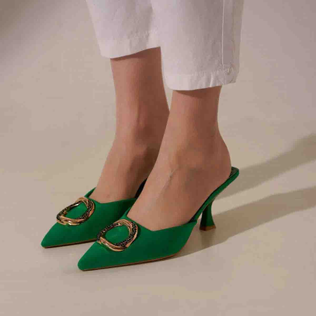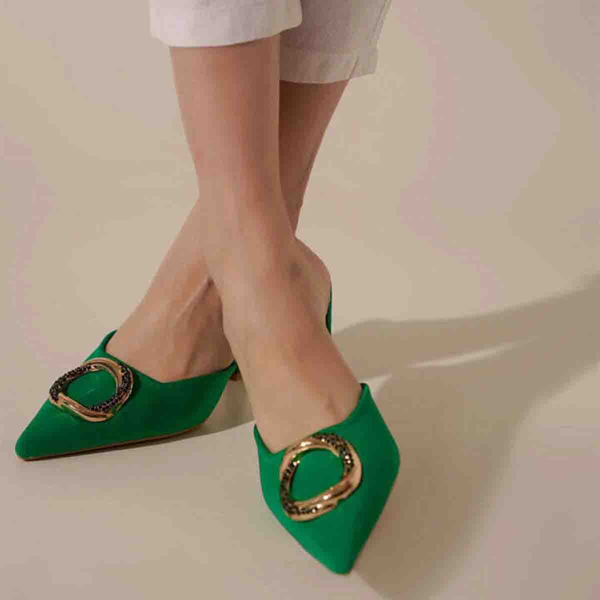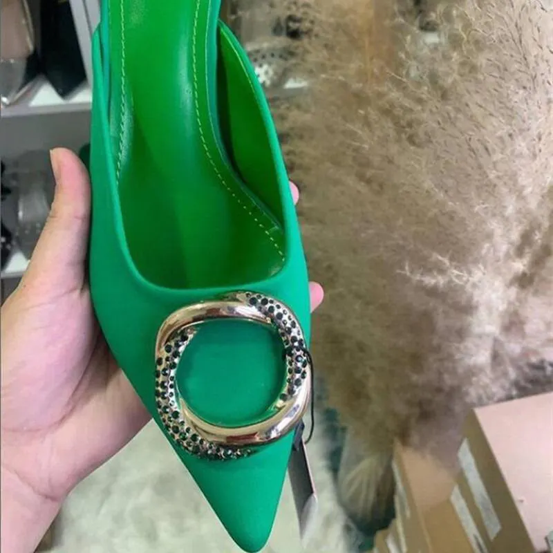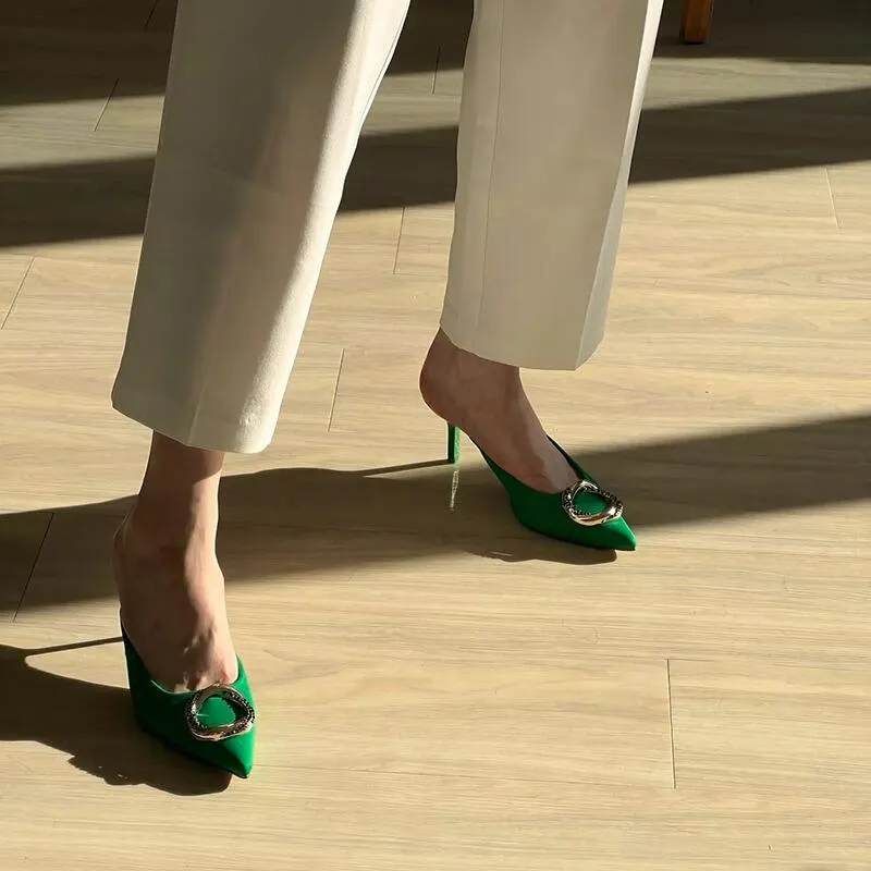 Pointed Toe Green Mule Heels With Rhinestone Buckle