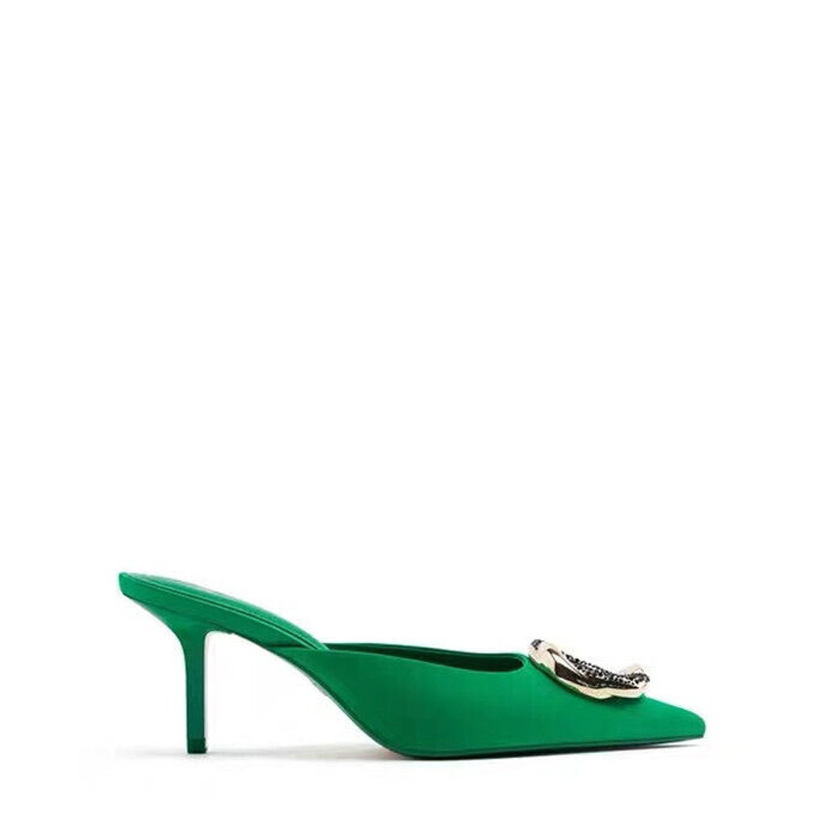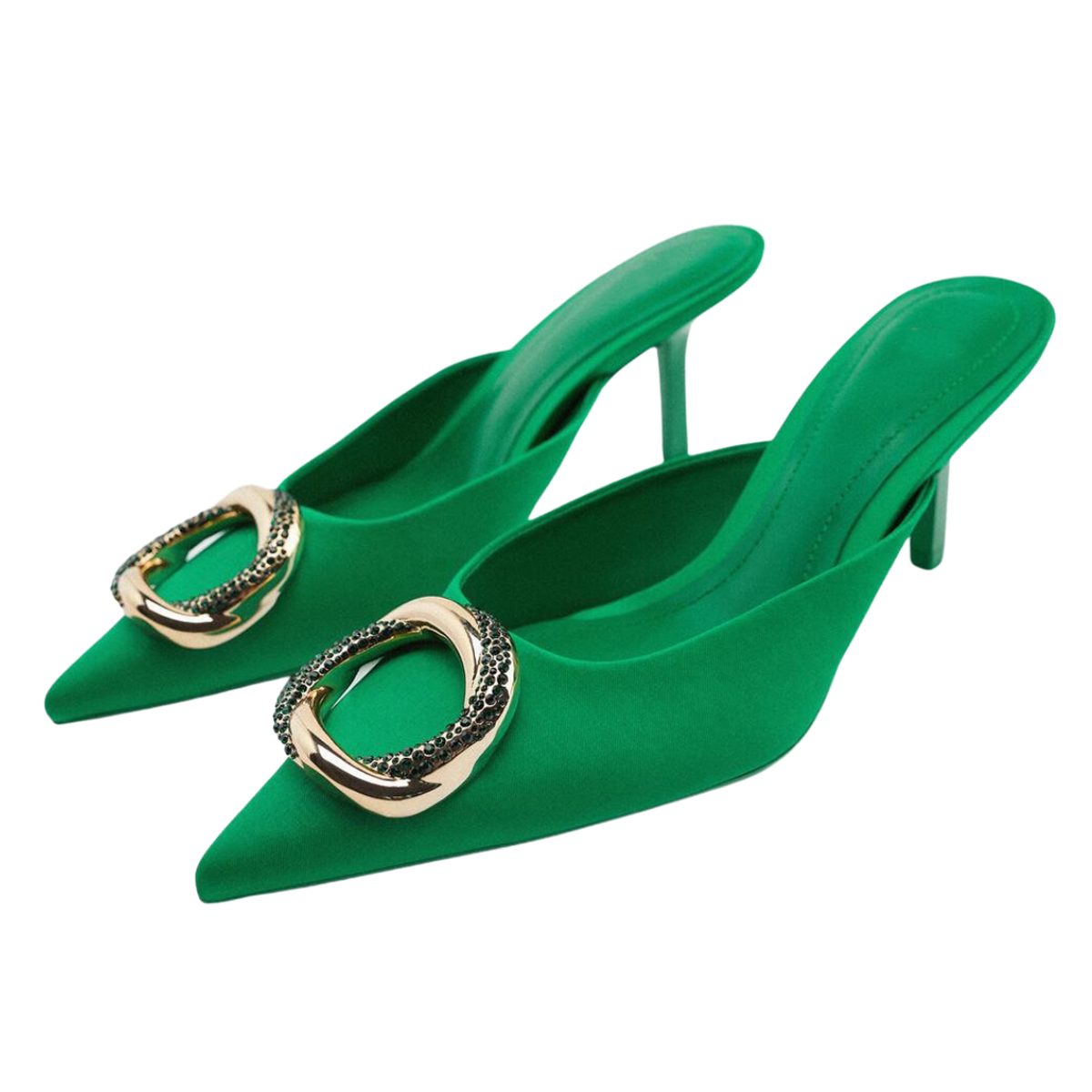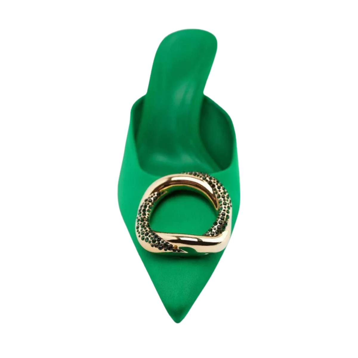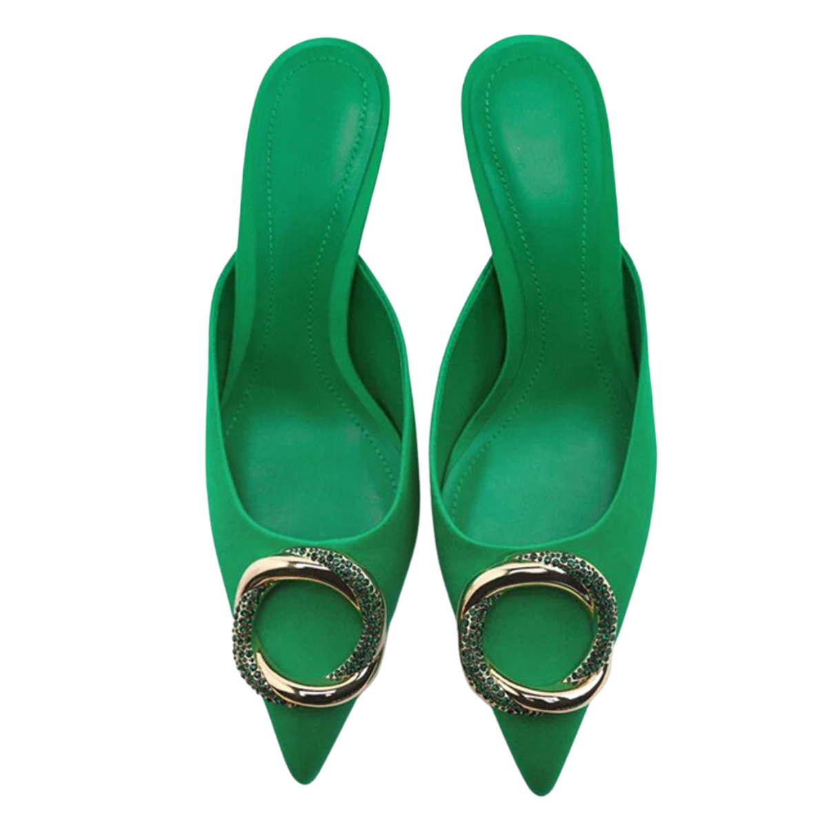 Pointed Toe Green Mule Heels With Rhinestone Buckle