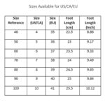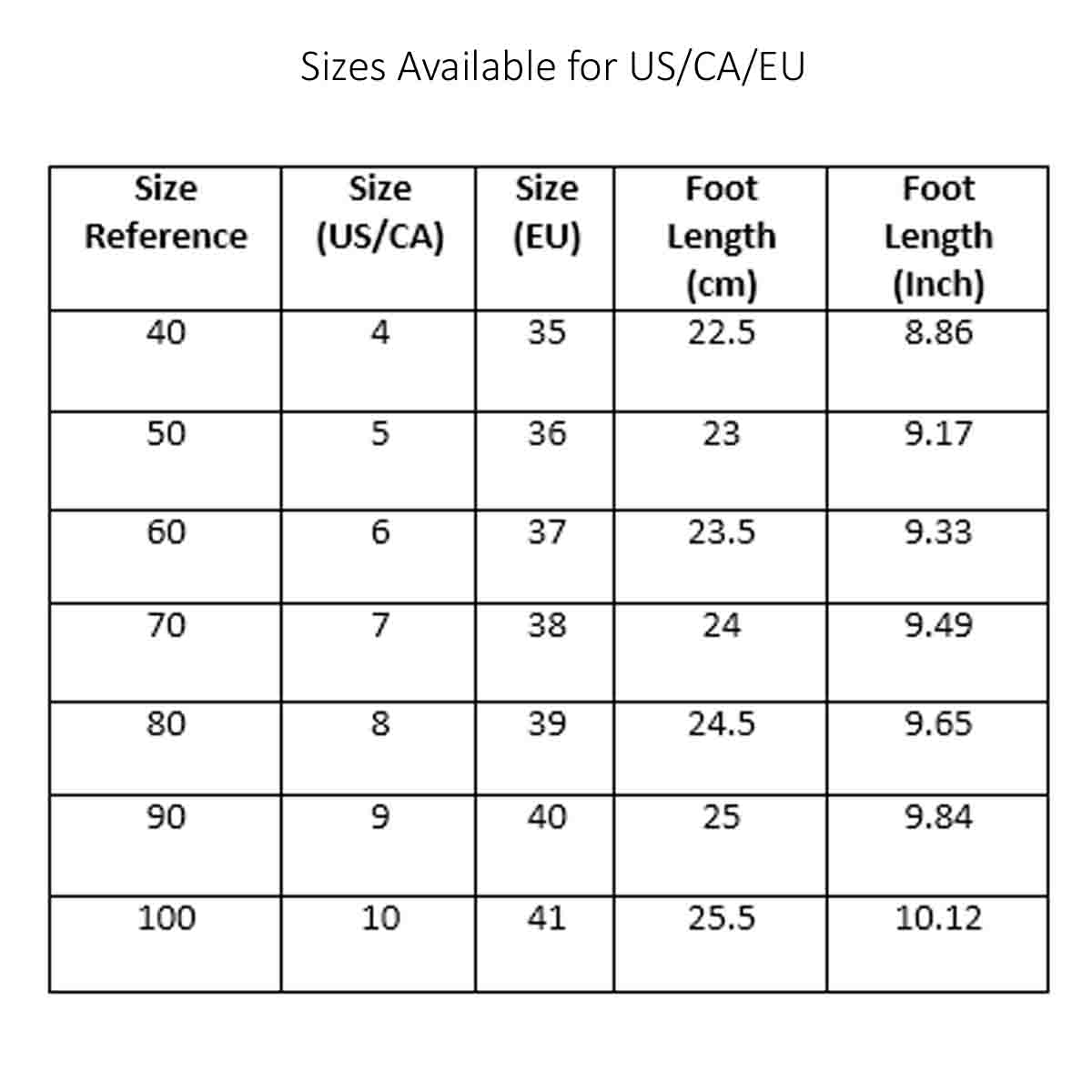 | Size Reference | Size (US/CA) | Size (EU) | Foot Length (cm) | Foot Length (Inch) |