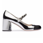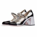 Patent Leather Cap Toe Silver Black Block Heel With Pearl Strap
