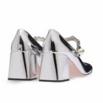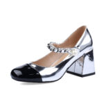 Aim big by wearing these big block heels with an exceptionally unique and attractive design. These remarkable shoes are handmade and designed with glossy Silver Patent Leather Pumps with Pearl Strap.