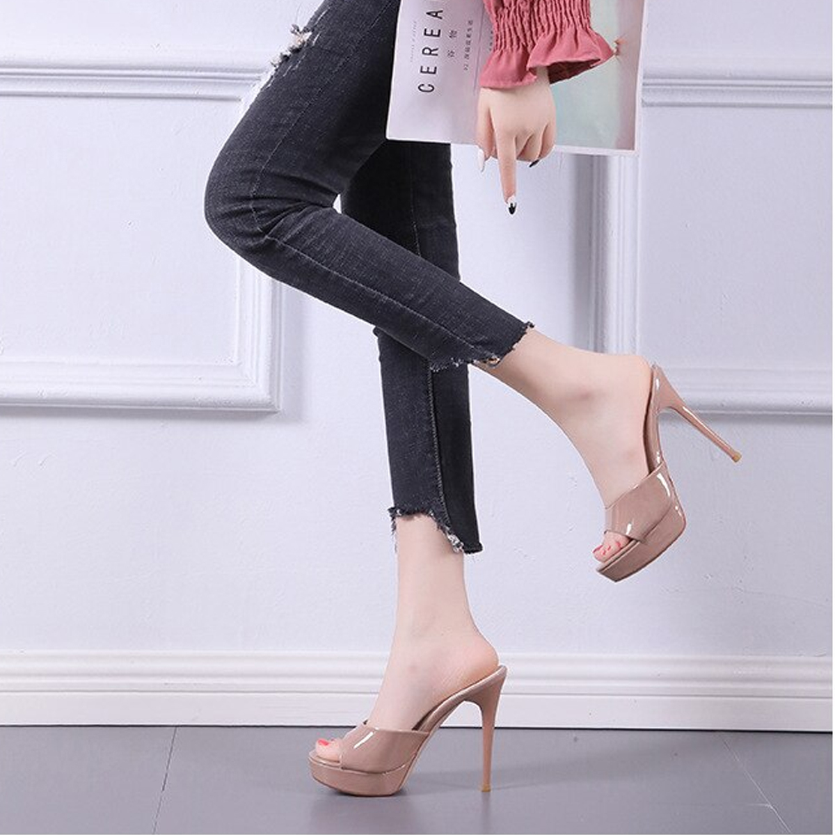 1 PCS x Nude Patent Leather In Platform Peep Toe Stiletto Mule Heel