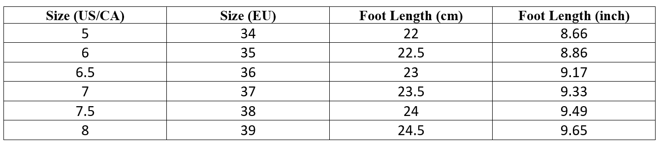| Size (US) | Size (EU) | Foot Length (cm) | Foot Length (Inch) |