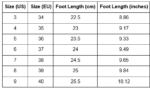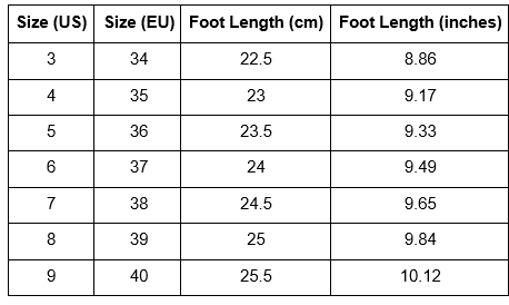 | Size (US) | Size (EU) | Foot Length (cm) | Foot Length (inches) |
