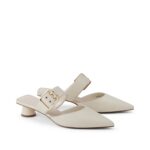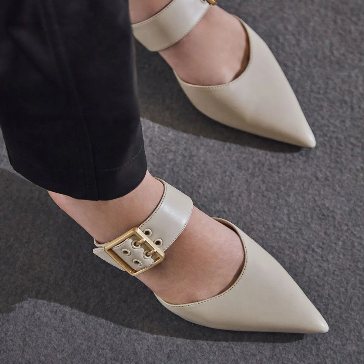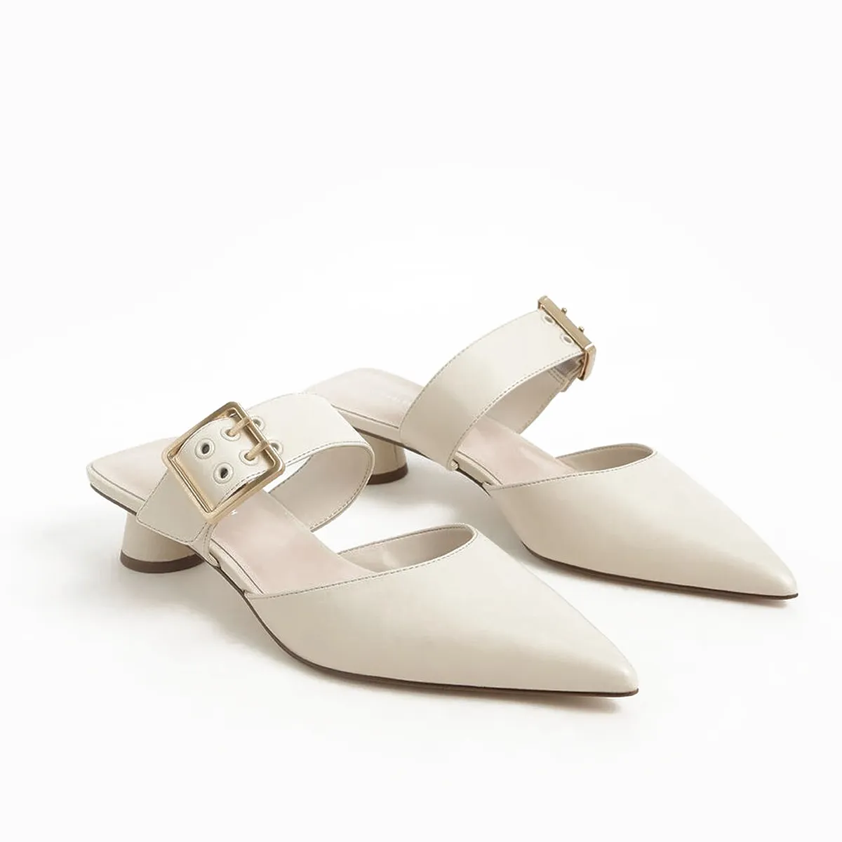Beige Pointed Toe Mule Heel with Double Hole Buckle