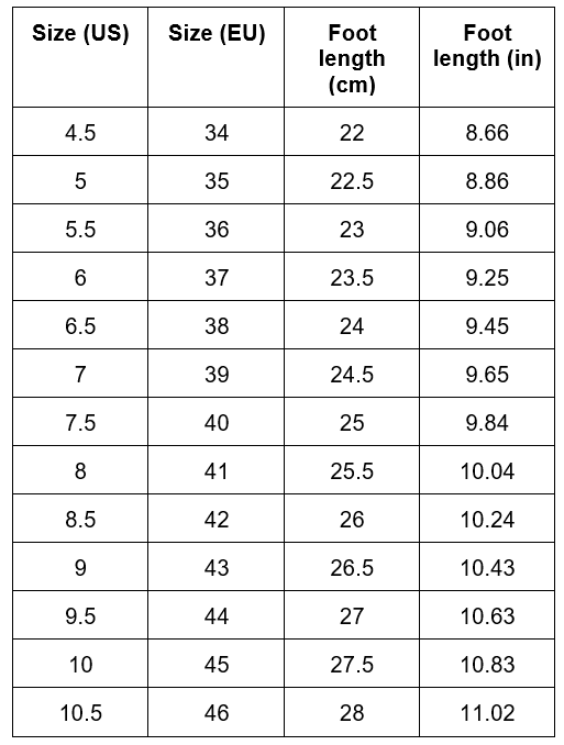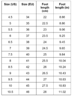| Size (US/CA) | Size (EU) | Foot length (cm) | Foot length (inch) |