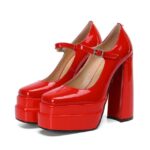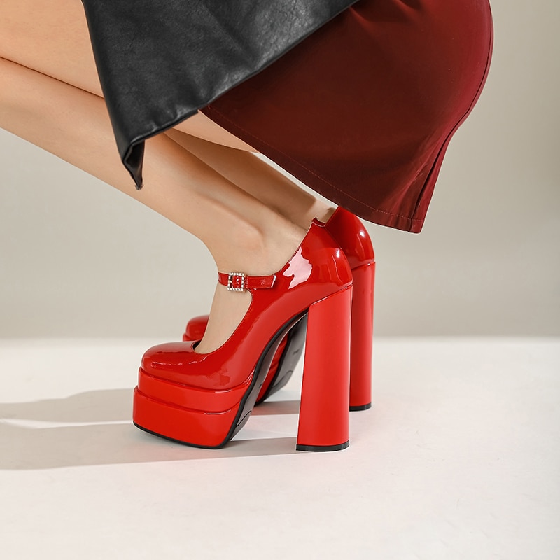 These Red Chunky Platform Pump Heels are originally handmade with patent leather for a glossy finish. The insole has a sheepskin footbed, which is comfortable and provides cushioning to give you a soft and smooth walking gait. These round-toe pump-style heels are topped with an adjustable buckle strap. It has a cool, funky, and punk-styled silhouette with a heightened dramatic platform and a block heel. You can pair this luxe pair with any fancy, formal, or funky outfit. This is a lovely gift option for all heel-loving ladies.
