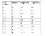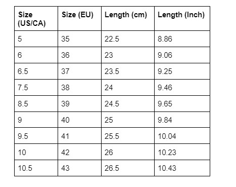 | Size (US/CA) | Size (EU) | Length (cm) | Length (Inch) |