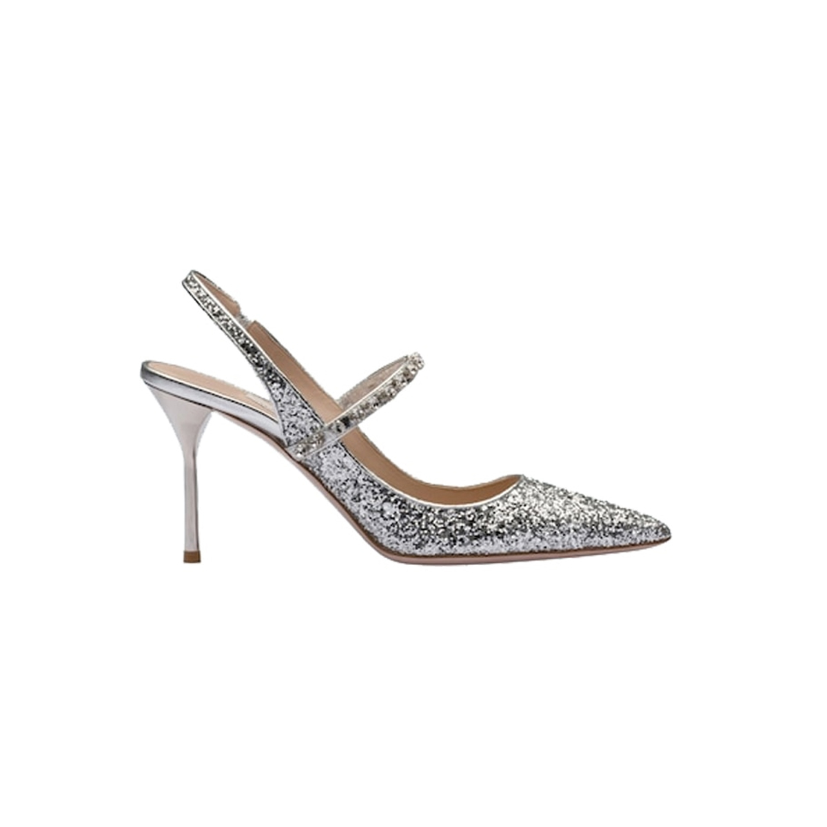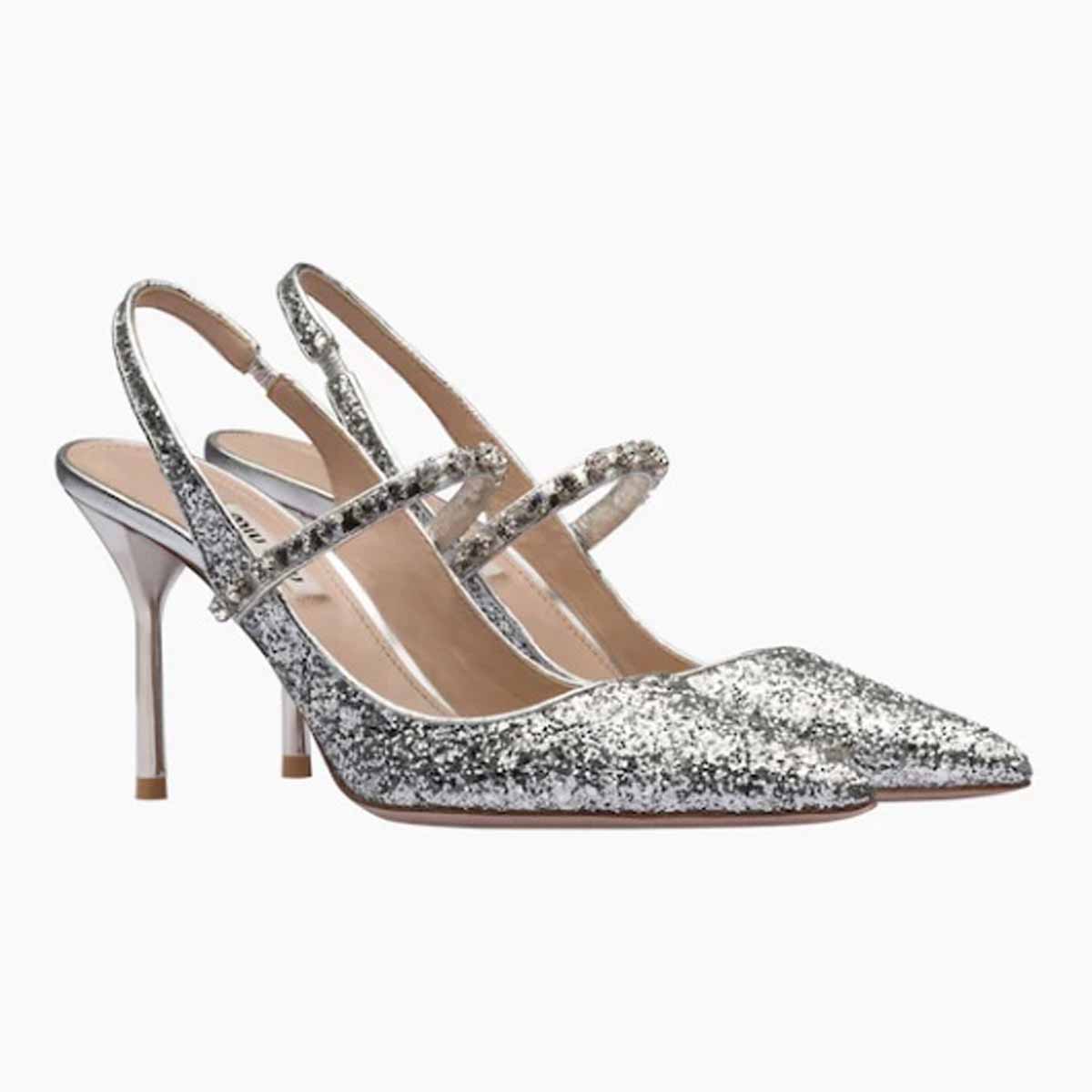 Glitter Pointed Toe Heels | Mid Strap Slingback Silver Pumps