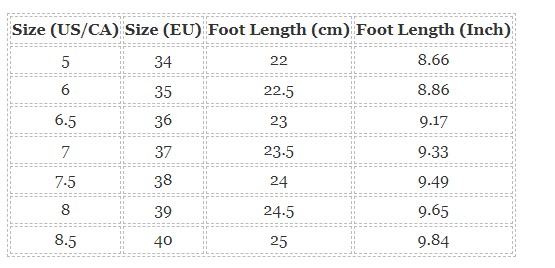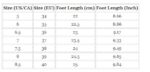 | Size (US/CA) | Size (EU) | Foot Length (cm) | Foot Length (Inch) |