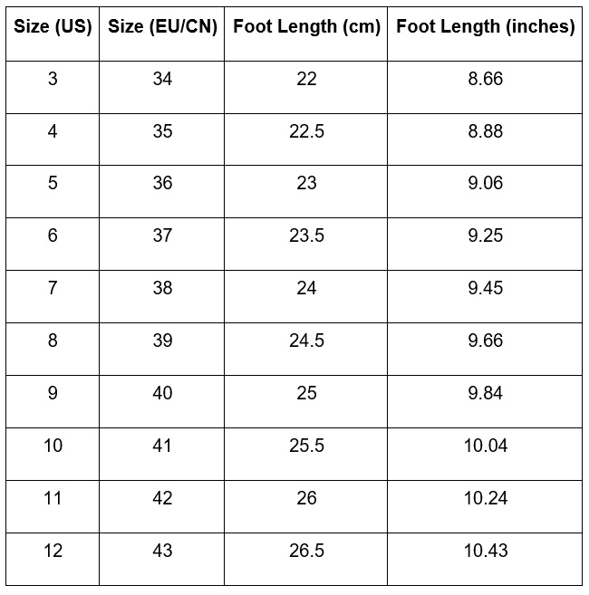 | Size (US) | Size (EU/CN) | Foot Length (cm) | Foot Length (inches) |