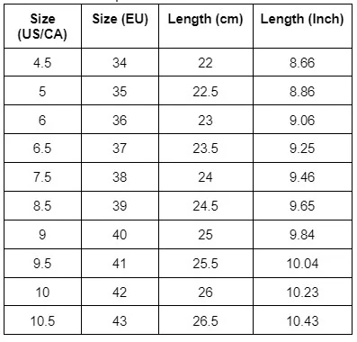 Size (EU) | Length (cm) | Length (Inch) |