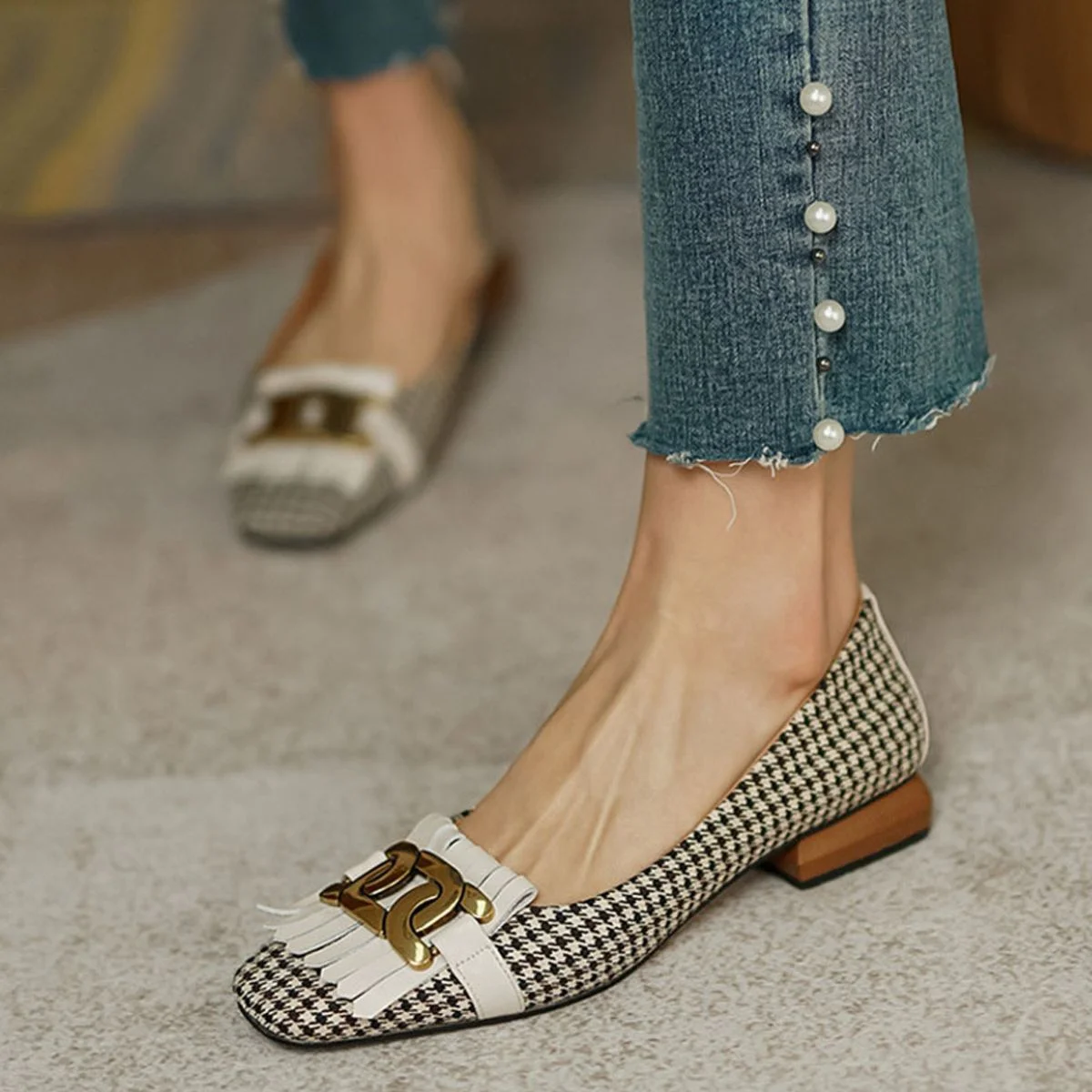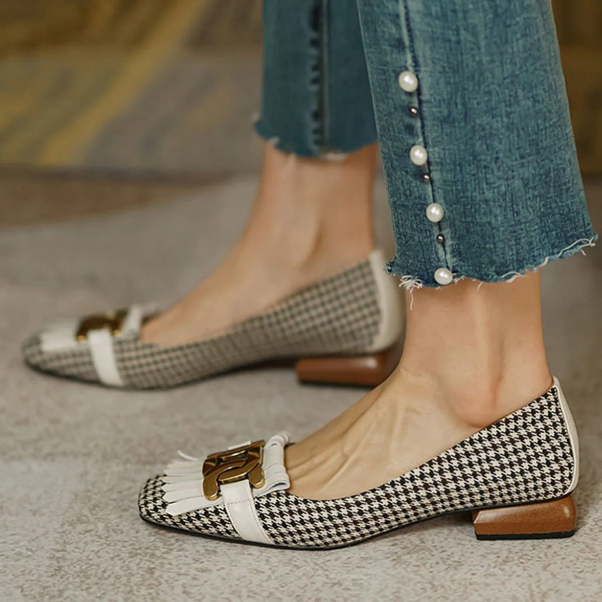 The unique tassel and bead detailing adds a touch of sophistication to the classic square toe design.