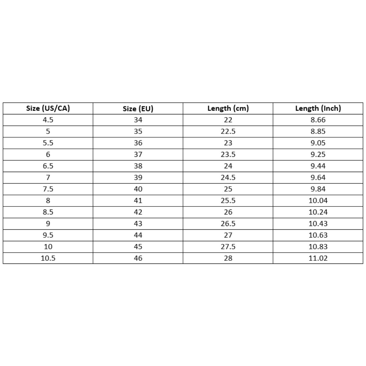 Size (EU) | Length (cm) | Length (Inch) |