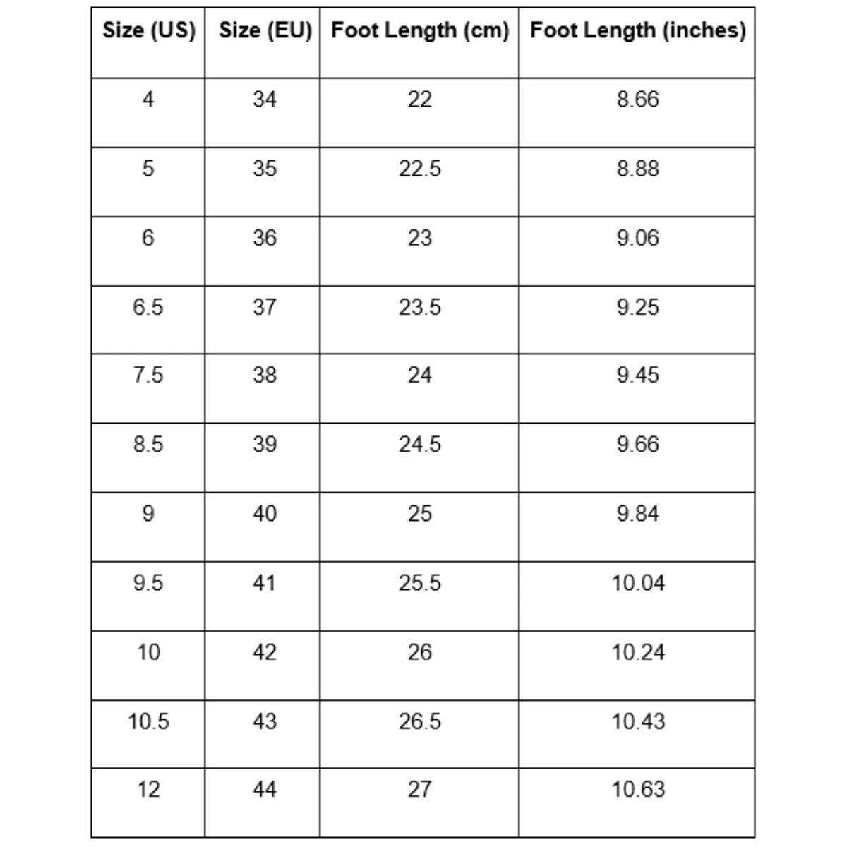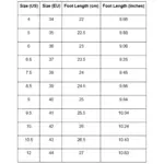 | Size (US) | Size (EU) | Foot Length (cm) | Foot Length (inches) |